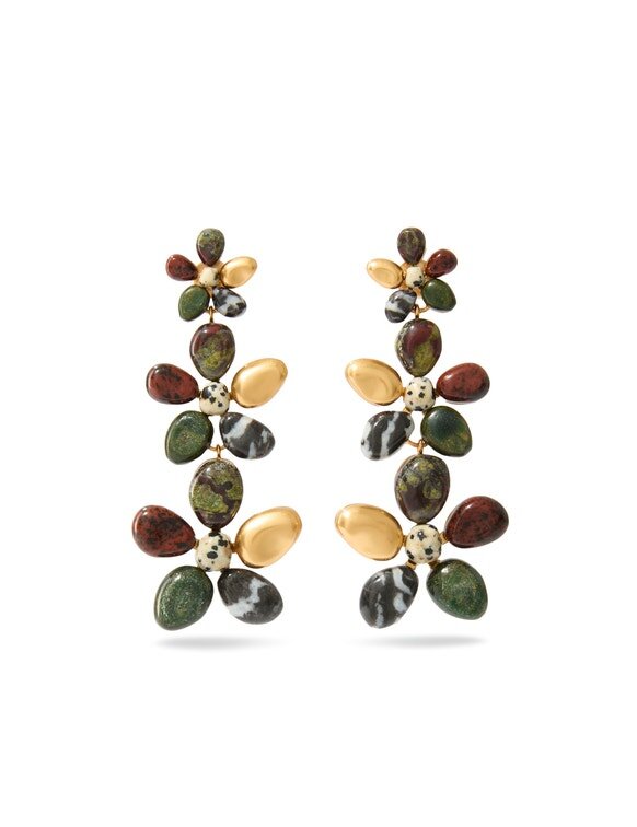 Pierre 1 : laiton plaqué or 16 carats ; Pierre 2 : obsidienne ; Pierre 3 : jaspe dalmatien ; Pierre 4 : hématite ; Pierre 5 : quartzite ; Pierre 6 : pierre zébrée ; Matériaux : laiton plaqué or 16 caratsNos pierres semi-précieuses sont taillées à la main pour mettre en valeur leur beauté naturelle, chaque pièce présentant des variations uniquesLes bijoux Zimmermann sont fabriqués en laiton plaqué or 16 caratsVeuillez les retirer avant de faire de l’exercice, de prendre une douche ou de nagerÉvitez tout contact avec les parfums, l’acétone, crèmes et de l’eau pour éviter tout dommage ou décolorationNettoyez délicatement avec un chiffon doux et non pelucheux ; évitez les produits nettoyantsConservez-les dans un endroit frais et sec, à l’abri de la lumière directe du soleil et de la chaleurConsultez toujours l’étiquette ou la fiche d’entretien pour connaître les instructions d’entretien spécifiques.