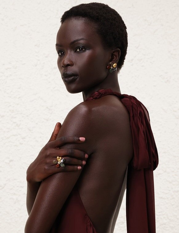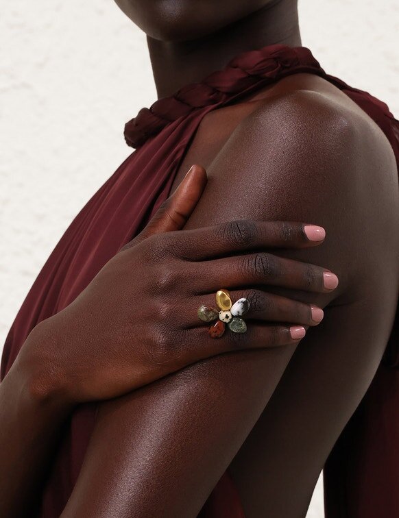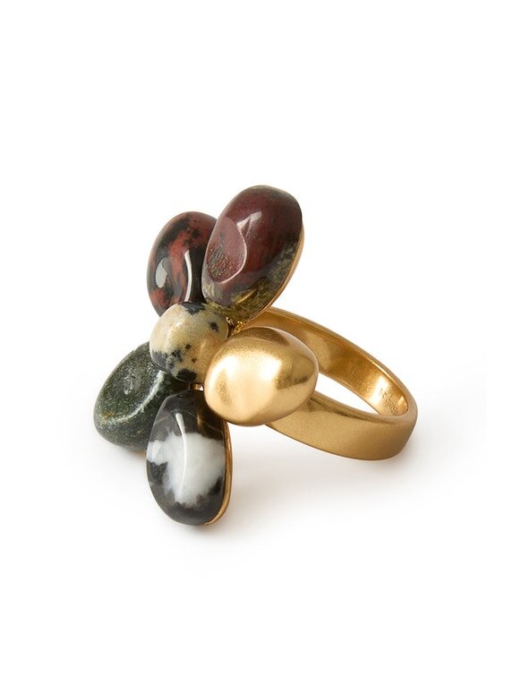 La bague Norma en or/multicolore de notre collection printemps 2026, Kindred Spirit. Une bague imposante plaquée or, ornée de pierres naturelles colorées disposées en motif floral.