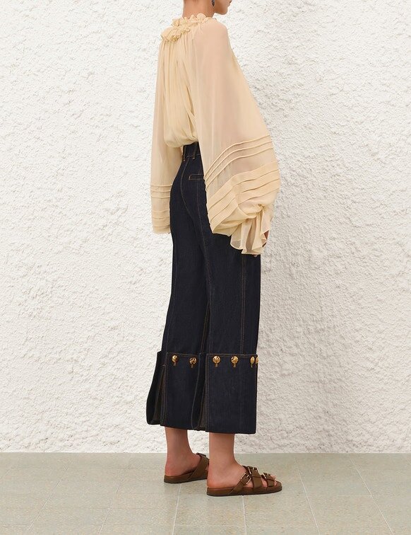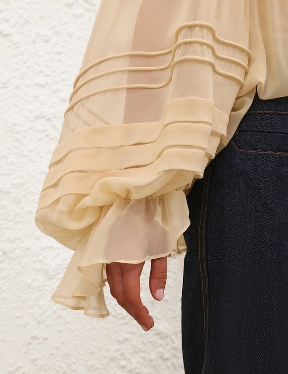 Le chemisier cordé Rebellion en crème issu de notre collection Croisière 2026, Twisted Romance. Un chemisier en soie doté de manches longues bouffantes avec des poignets élastiqués, d’une bordure à volants sur le col et de boutons perlés sur le devant.