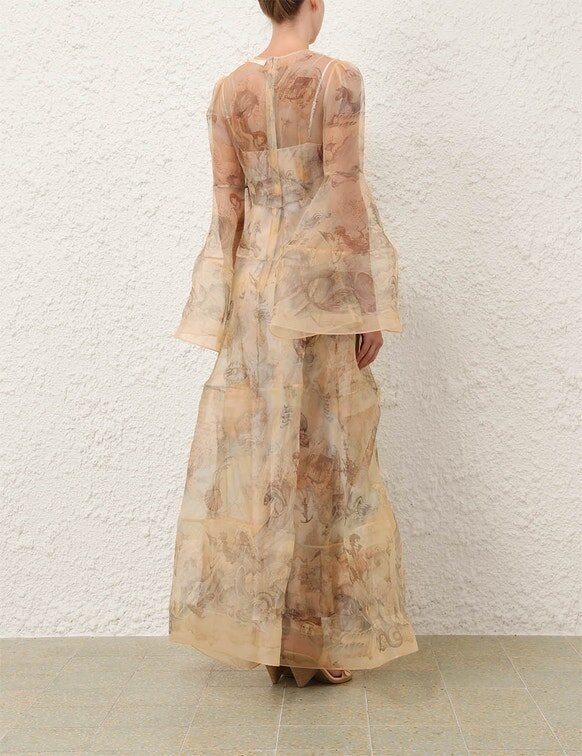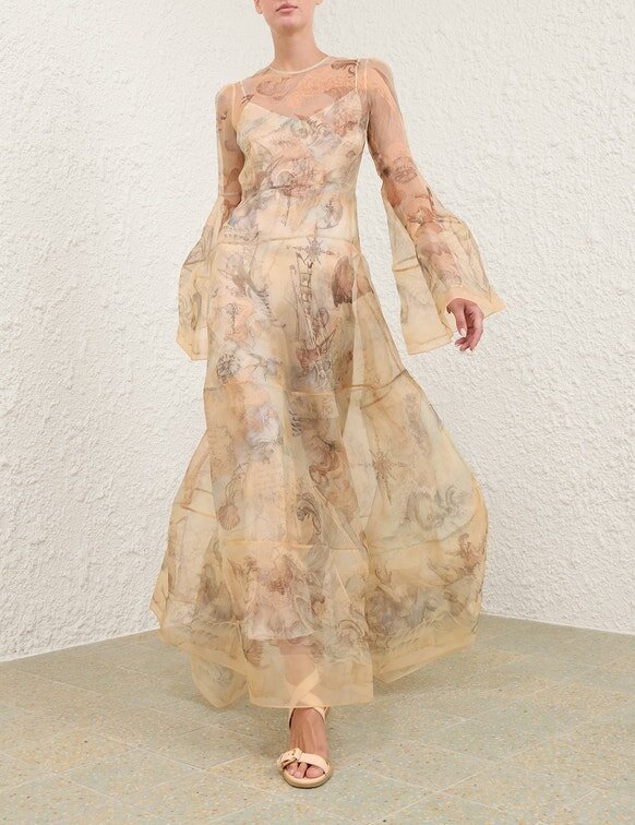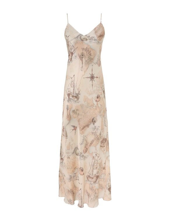 La robe « Rebellion Lantern » en Ocean Atlas, issue de notre collection Croisière 2026, « Twisted Romance ». Une robe longue en soie dotée d’un col rond, de longues manches cloche aux poignets larges et d’une jupe à volants.